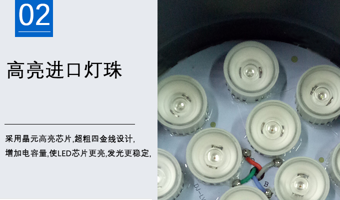 2、采用晶元高亮芯片,超粗四金線設(shè)計(jì),增加電容量,使LED芯片更亮,發(fā)光更穩(wěn)定,