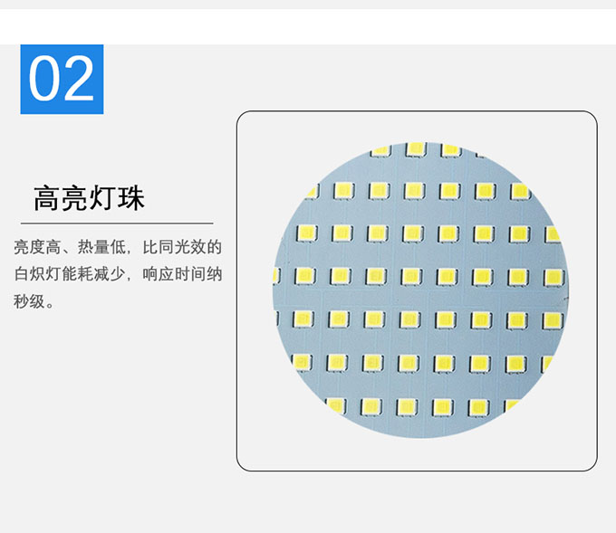 2.高亮燈珠,亮度高、熱量低,比同光效的白熾燈能耗減少,響應時間納秒級。